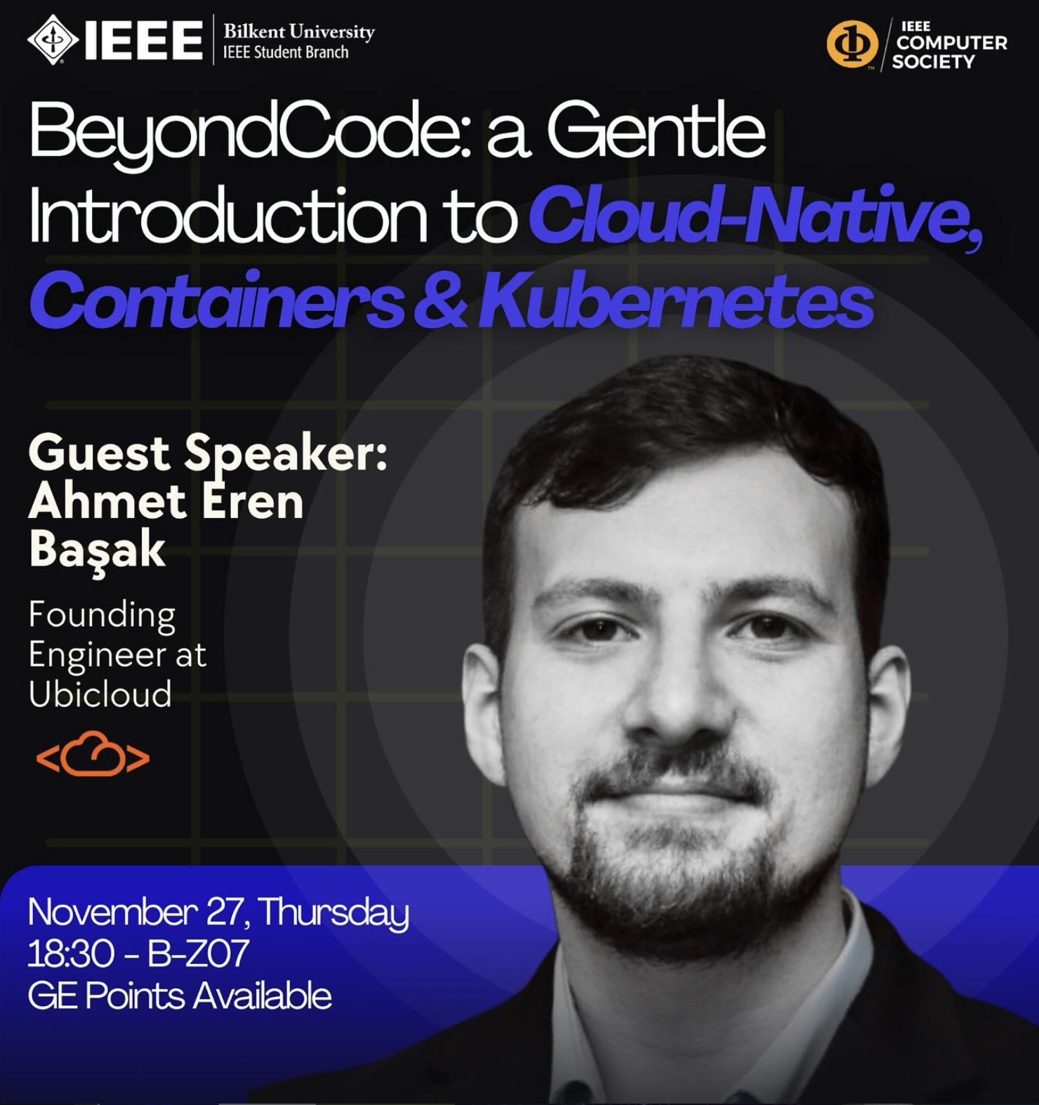 Bilkent IEEE Computer Society hosted BeyondCode, an insightful session featuring Ahmet Eren Başak, Founding Engineer at Ubicloud. This introduced the world of Cloud-Native, Containers and Kubernetes, offering students a clear path into modern software architecture. By exploring these industry-standard technologies, participants gained valuable knowledge on how scalable, resilient applications are built and managed in the cloud today.