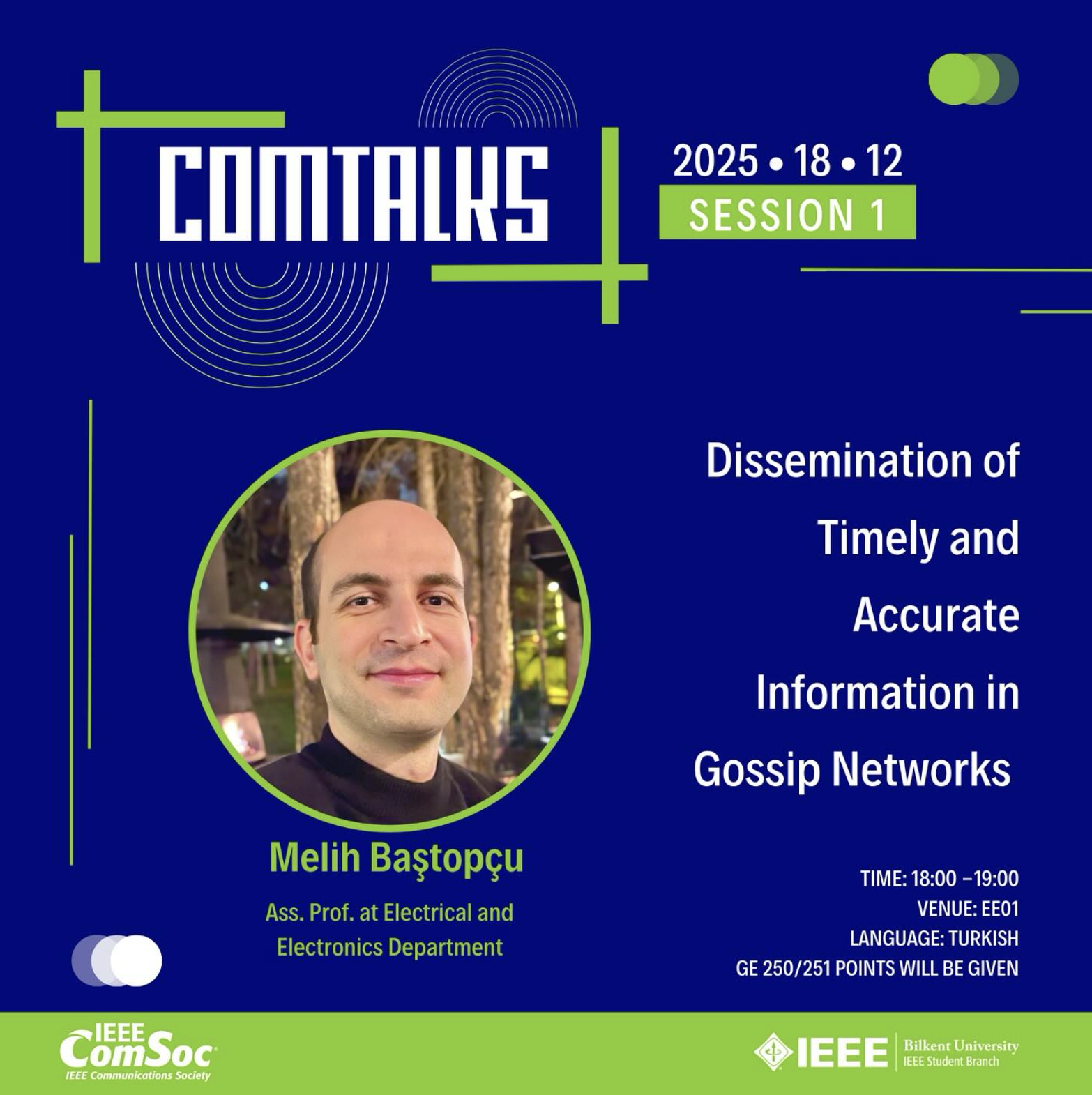 Bilkent IEEE Communications Society launched its ComTalks series with an academic session featuring Asst. Prof. Melih Baştopçu. The talk, titled “Dissemination of Timely and Accurate Information in Gossip Networks,” explored the complex dynamics of information flow and data freshness in decentralized systems. By delving into the mathematical and technical frameworks of gossip protocols, the session provided participants with academic insights into how accuracy is maintained in modern communication networks.