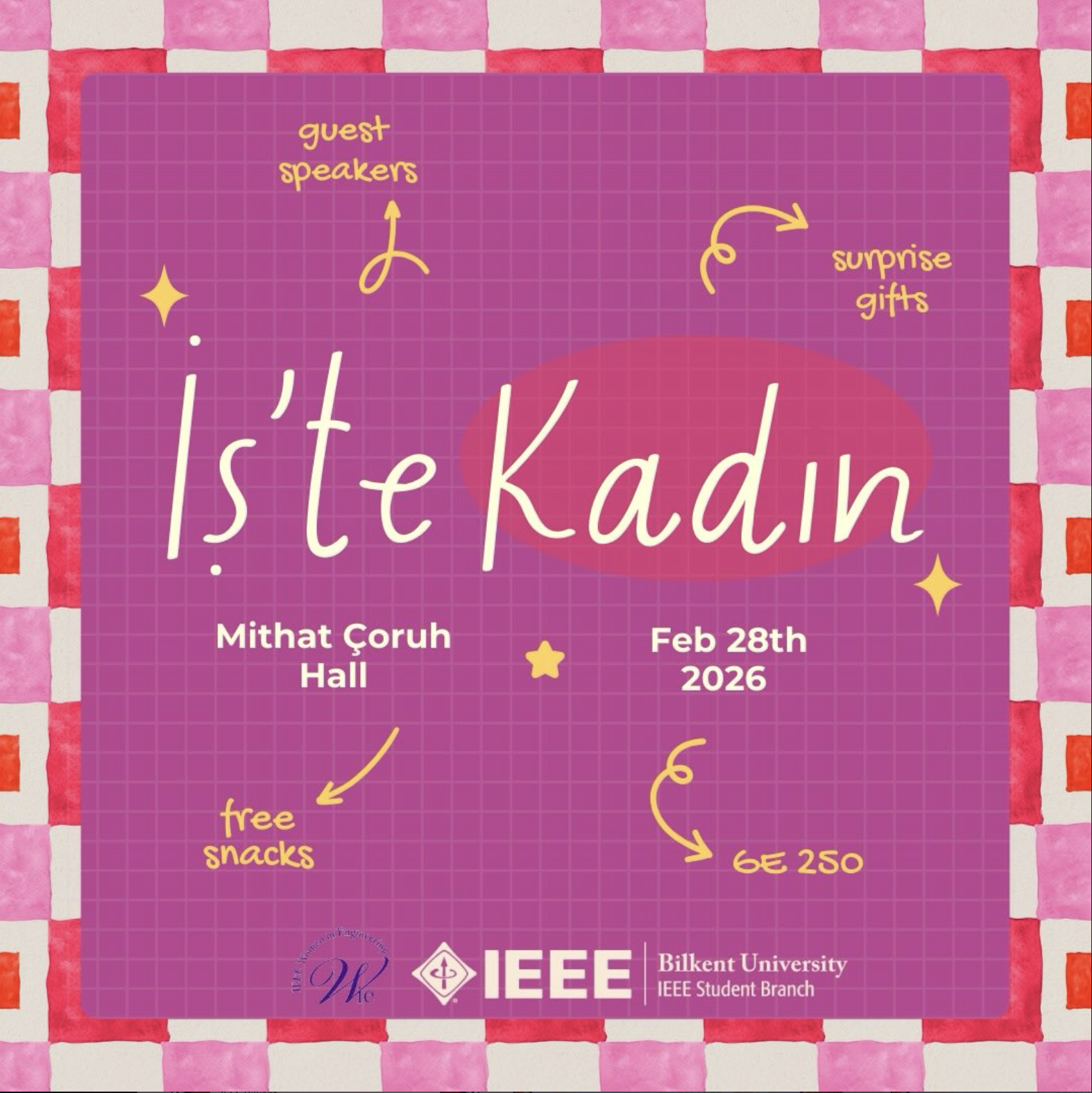 Bilkent IEEE Women in Engineering hosted İş’te Kadın, an empowering event dedicated to highlighting the impact of women in the professional world. Featuring inspiring guest speakers, the session provided a platform for students to gain career insights and discuss gender diversity in industry. With surprise gifts and networking opportunities, the event successfully fostered a supportive community for future female leaders and engineers.