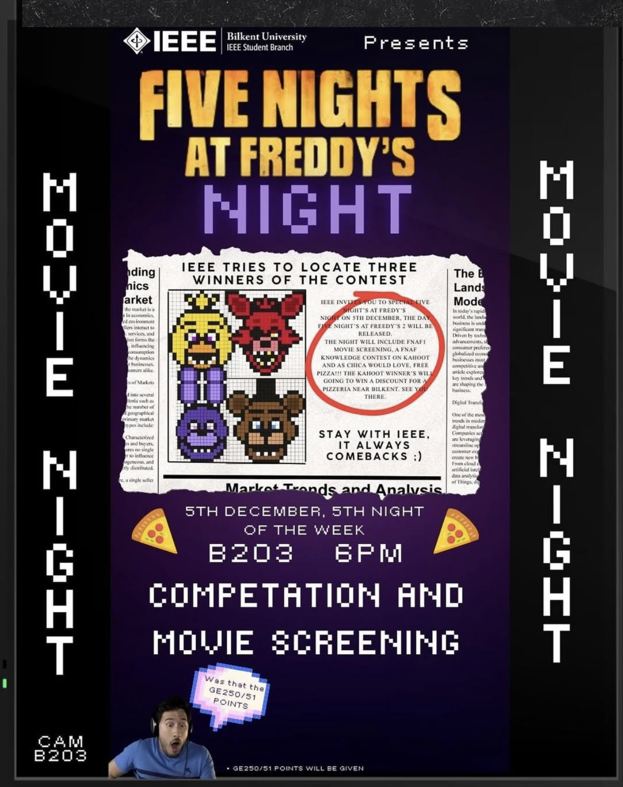Bilkent IEEE organized an immersive Five Nights at Freddy’s Night, bringing together fans for an evening of suspense and community. The event featured a screening of the FNAF movie alongside a high-stakes Kahoot knowledge contest to test the expertise of the “lore hunters” in attendance. Complete with free pizza and a chance to win discounts at local pizzerias, the night provided a perfect blend of entertainment and friendly competition, successfully creating a vibrant social space for students to connect over shared interests.